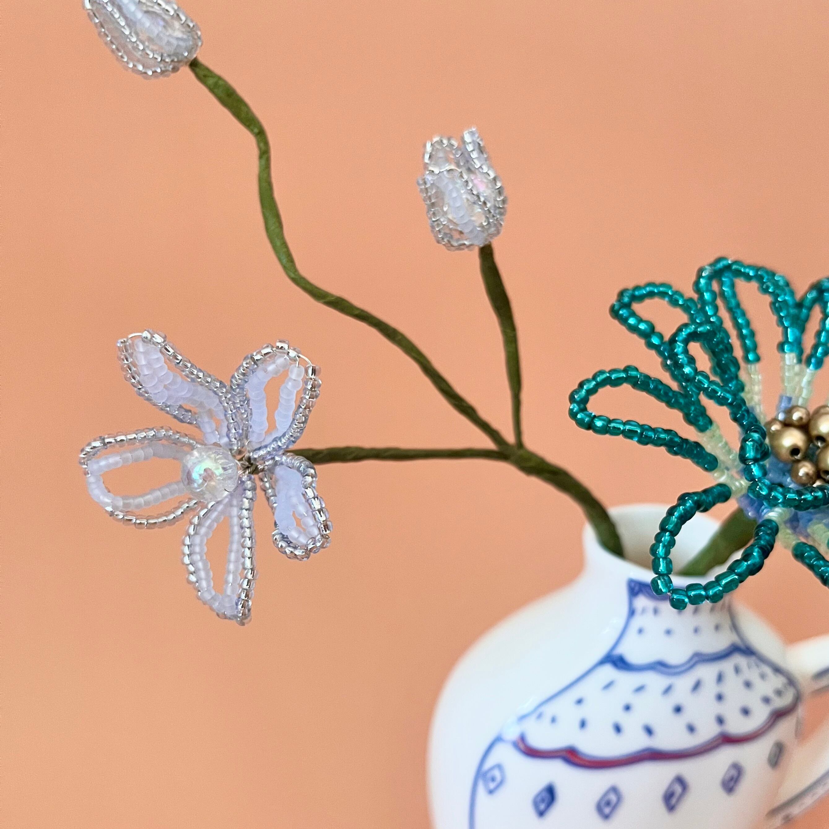 ご自身でご用意される場合、サイズが小さすぎたり軽量のものだと、ビーズフラワーの重さに耐えれず倒れる可能性があるため、陶器やガラス等の重量があるものや、ブーケと同じくらいのサイズ感のものをご用意いただくことをお勧めいたします。