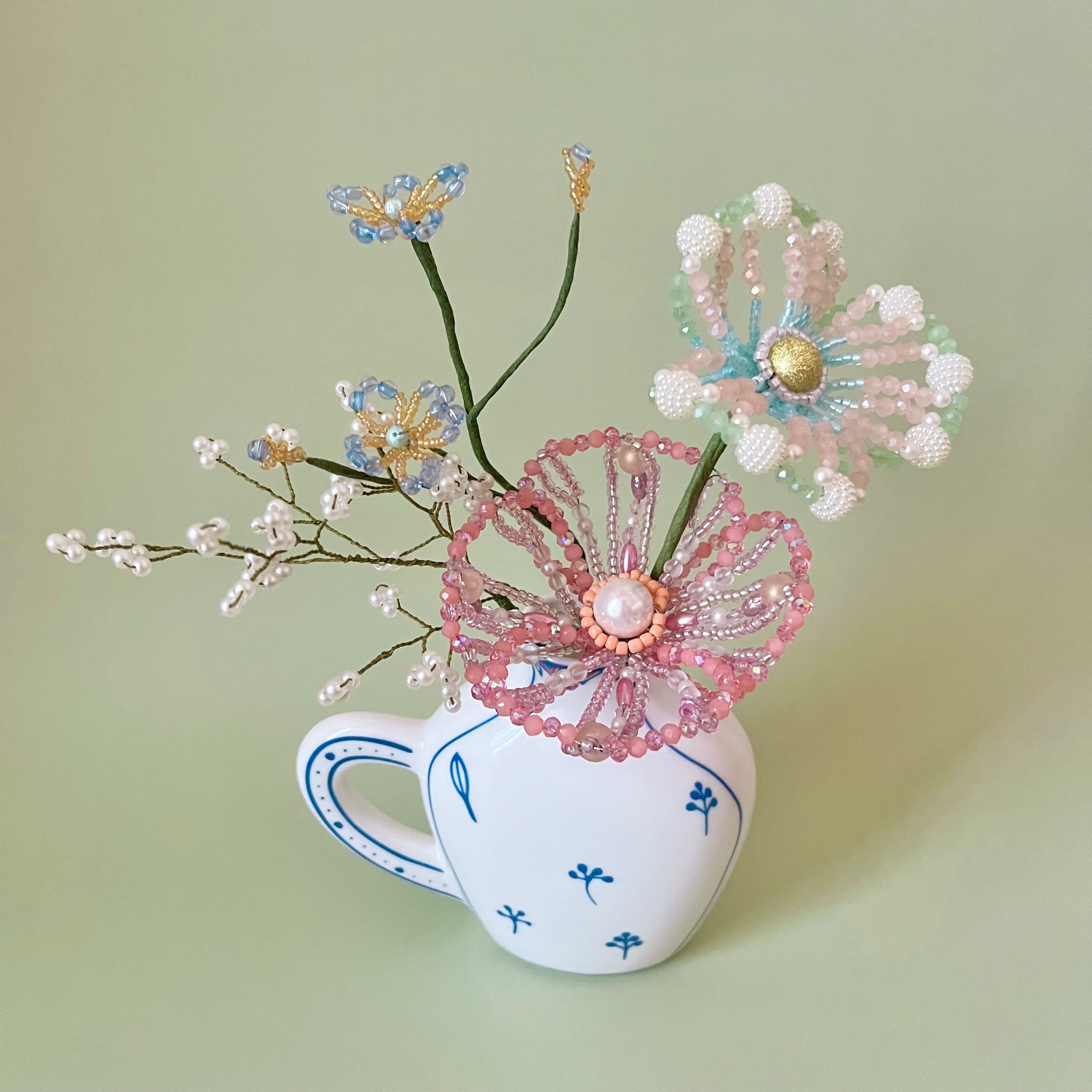 ご自身でご用意される場合、サイズが小さすぎたり軽量のものだと、ビーズフラワーの重さに耐えれず倒れる可能性があるため、陶器やガラス等の重量があるものや、ブーケと同じくらいのサイズ感のものをご用意いただくことをお勧めいたします。