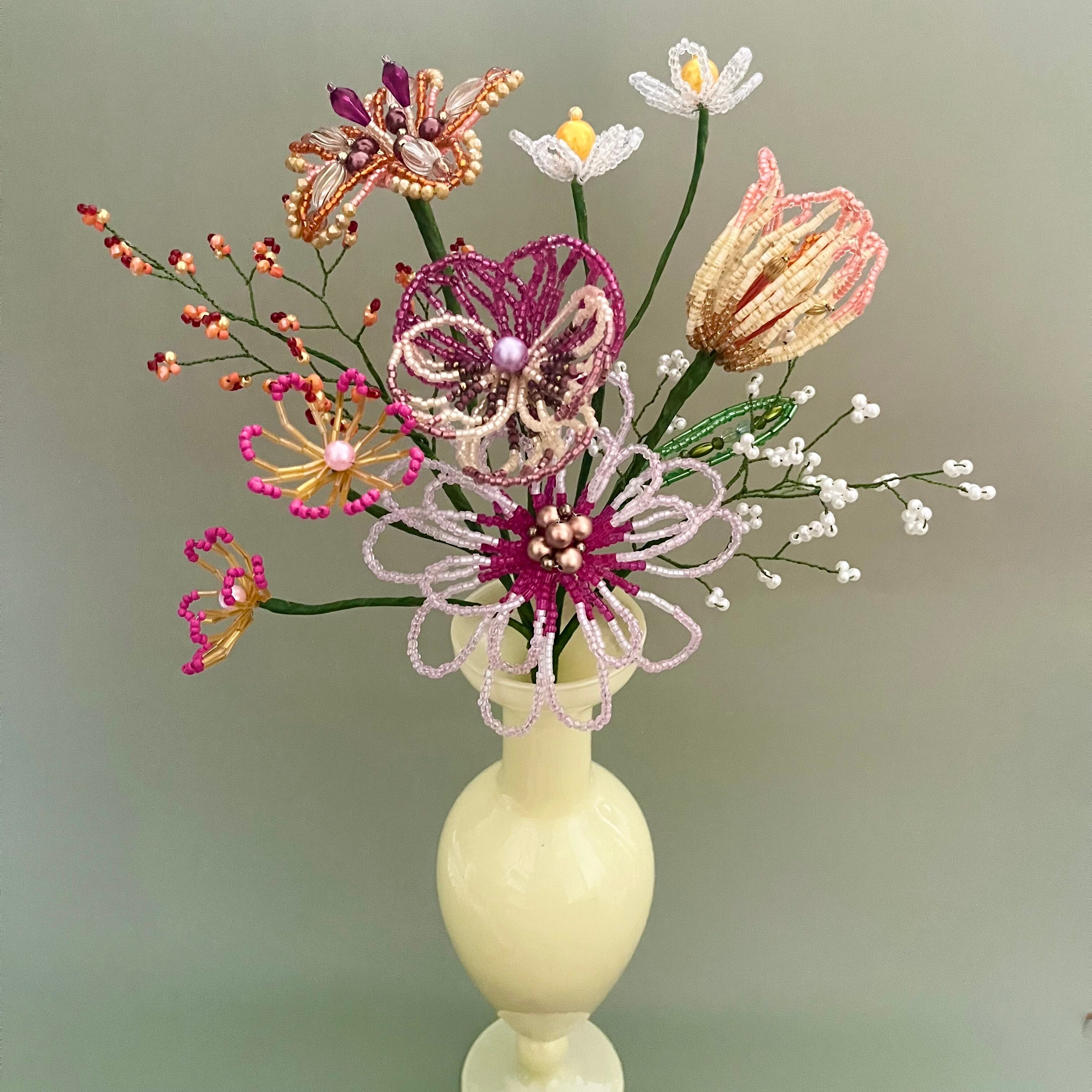 ご自身でご用意される場合、サイズが小さすぎたり軽量のものだと、ビーズフラワーの重さに耐えれず倒れる可能性があるため、陶器やガラス等の重量があるものや、ブーケと同じくらいのサイズ感のものをご用意いただくことをお勧めいたします。