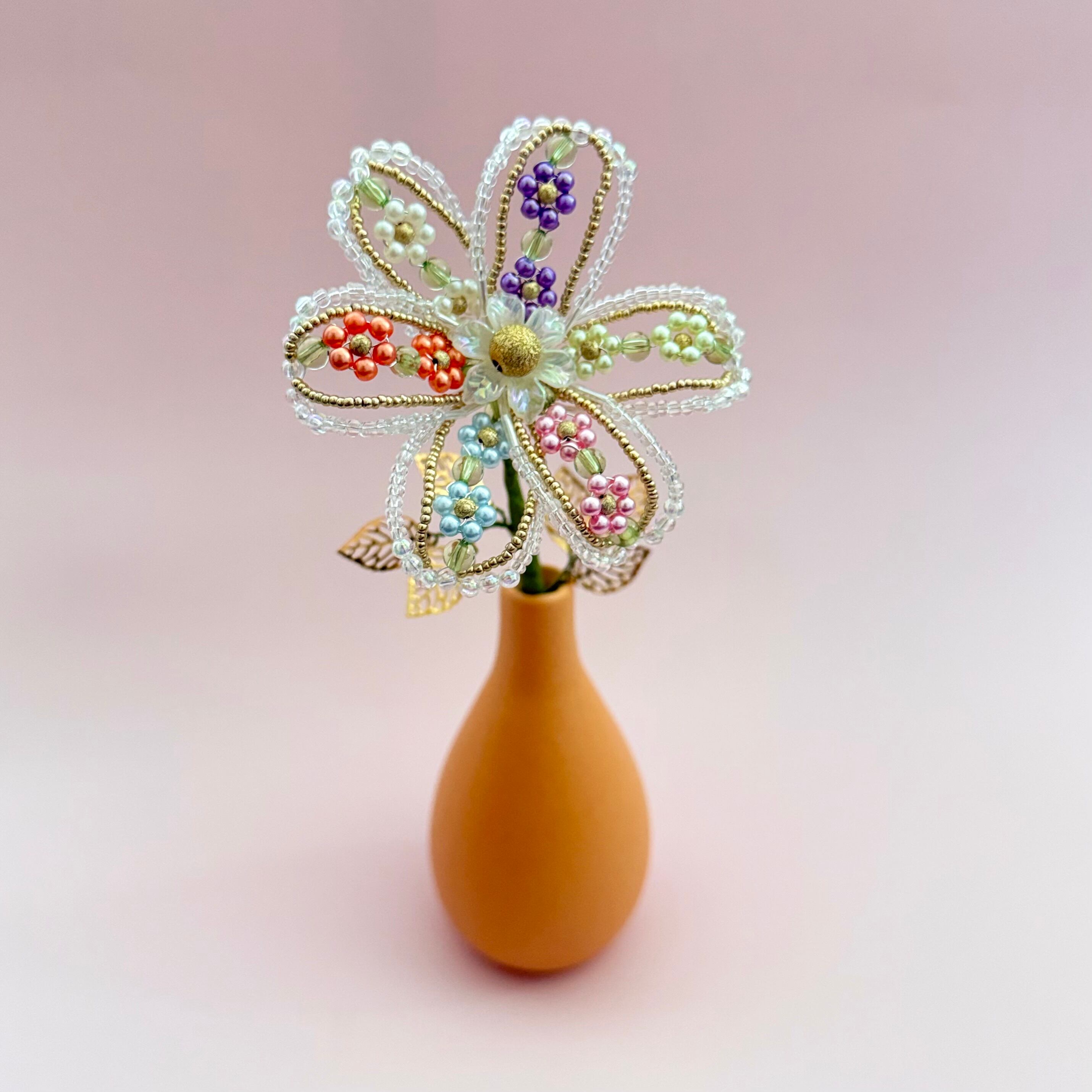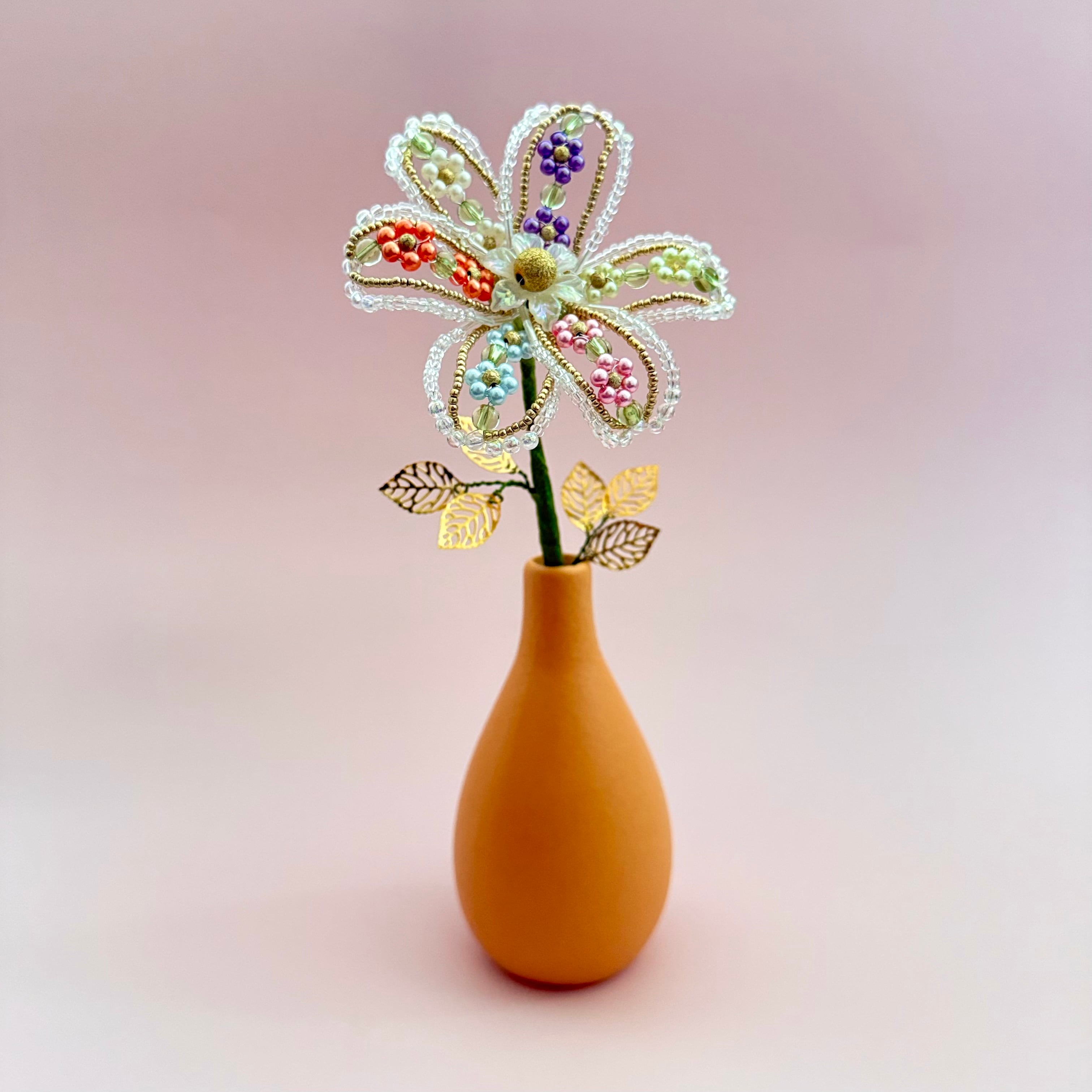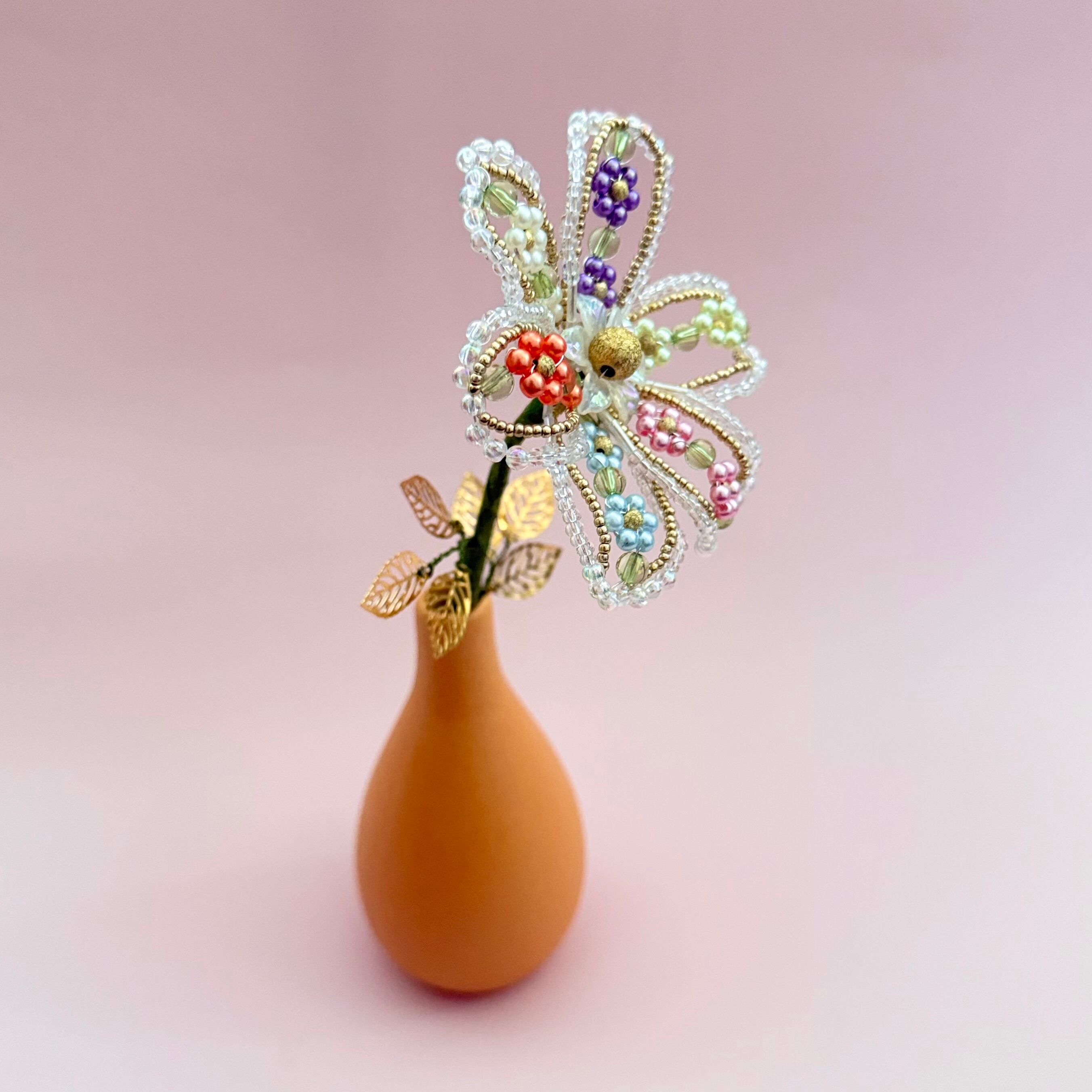 ご自身でご用意される場合、サイズが小さすぎたり軽量のものだと、ビーズフラワーの重さに耐えれず倒れる可能性があるため、陶器やガラス等の重量があるものや、ブーケと同じくらいのサイズ感のものをご用意いただくことをお勧めいたします。