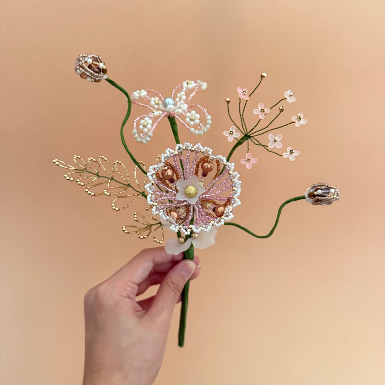 ビーズフラワー ブーケ(ピンク/ホワイト/ゴールド)