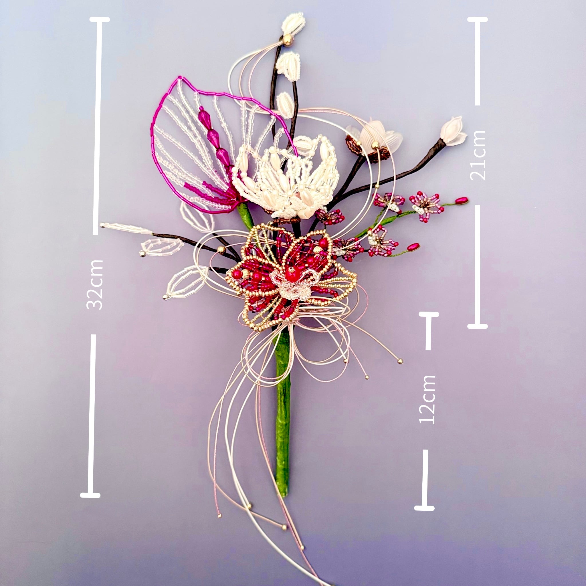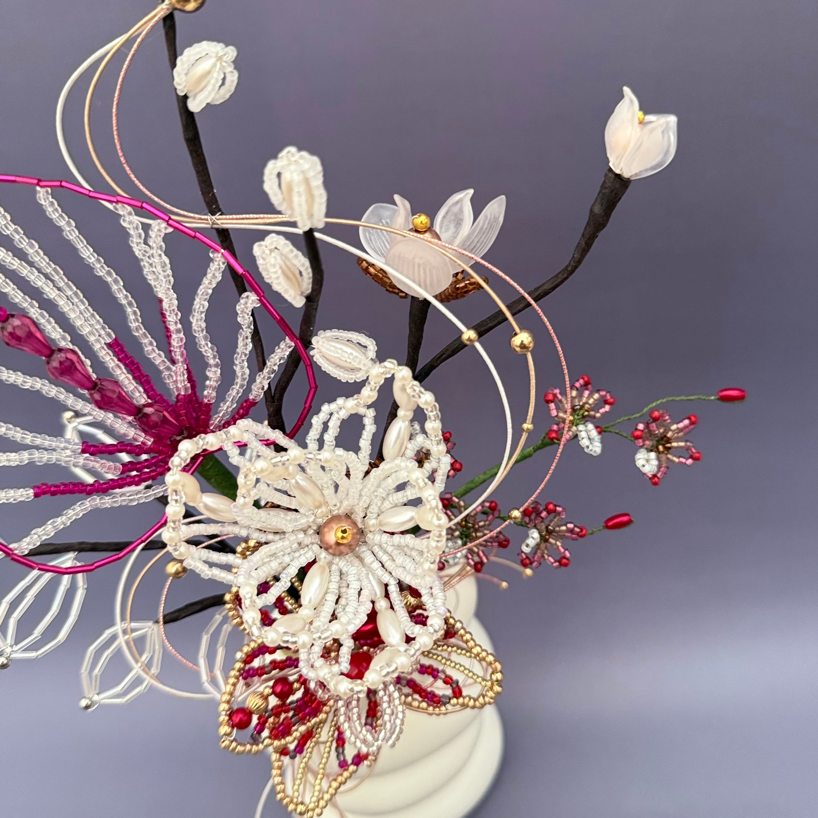 ご自身でご用意される場合、サイズが小さすぎたり軽量のものだと、ビーズフラワーの重さに耐えれず倒れる可能性があるため、陶器やガラス等の重量があるものや、ブーケと同じくらいのサイズ感のものをご用意いただくことをお勧めいたします。