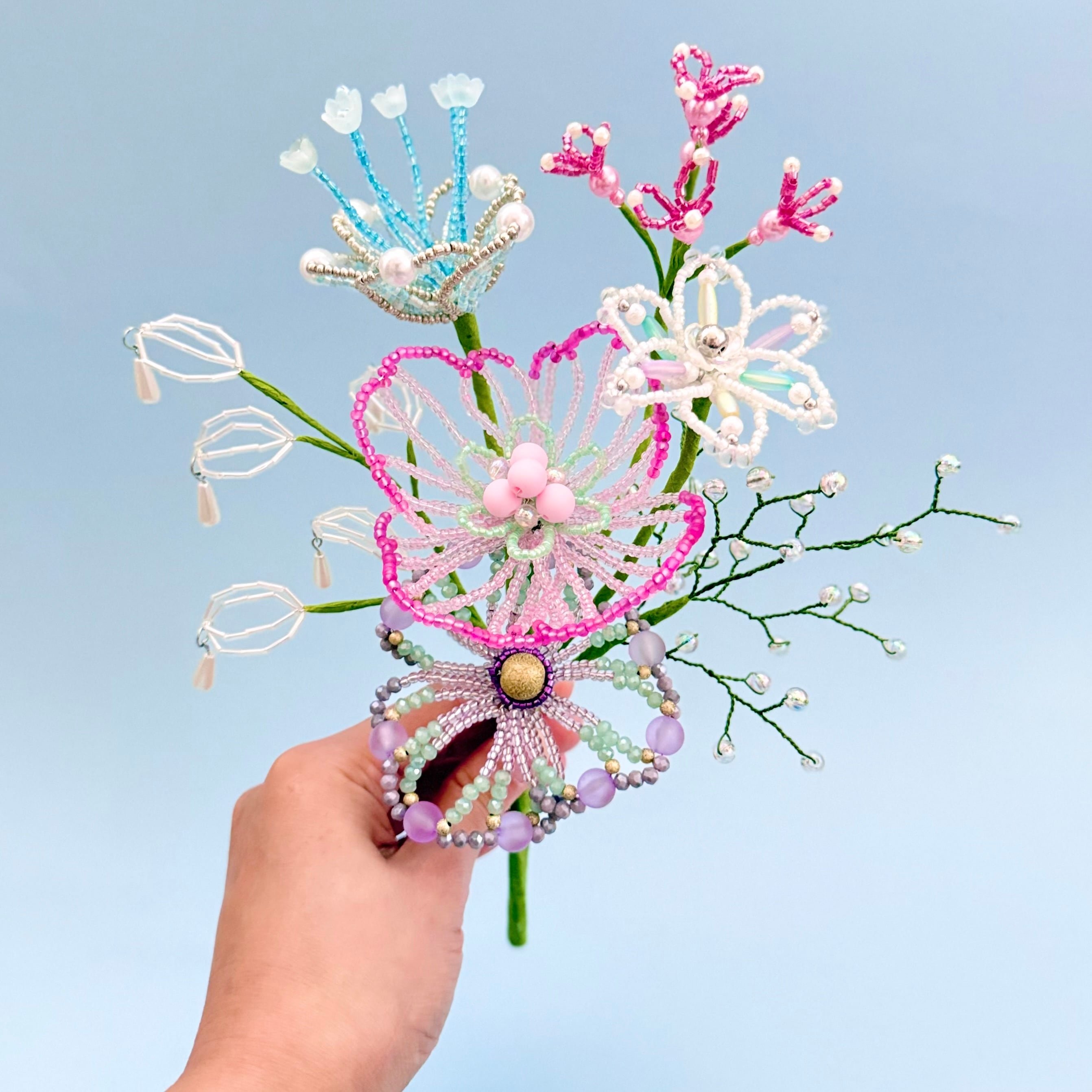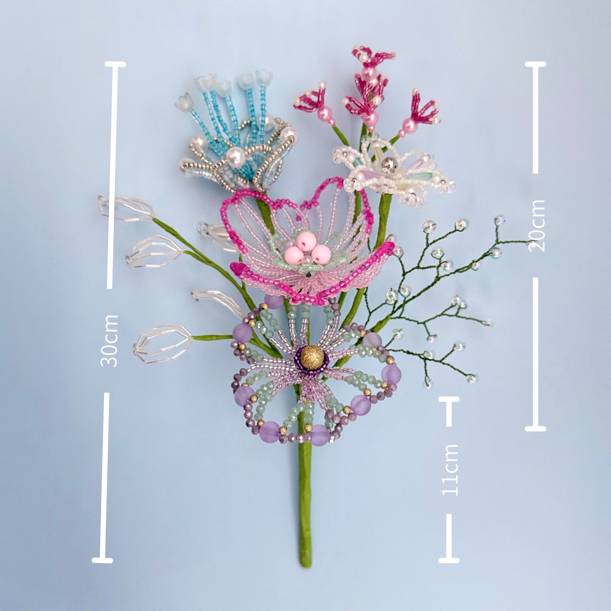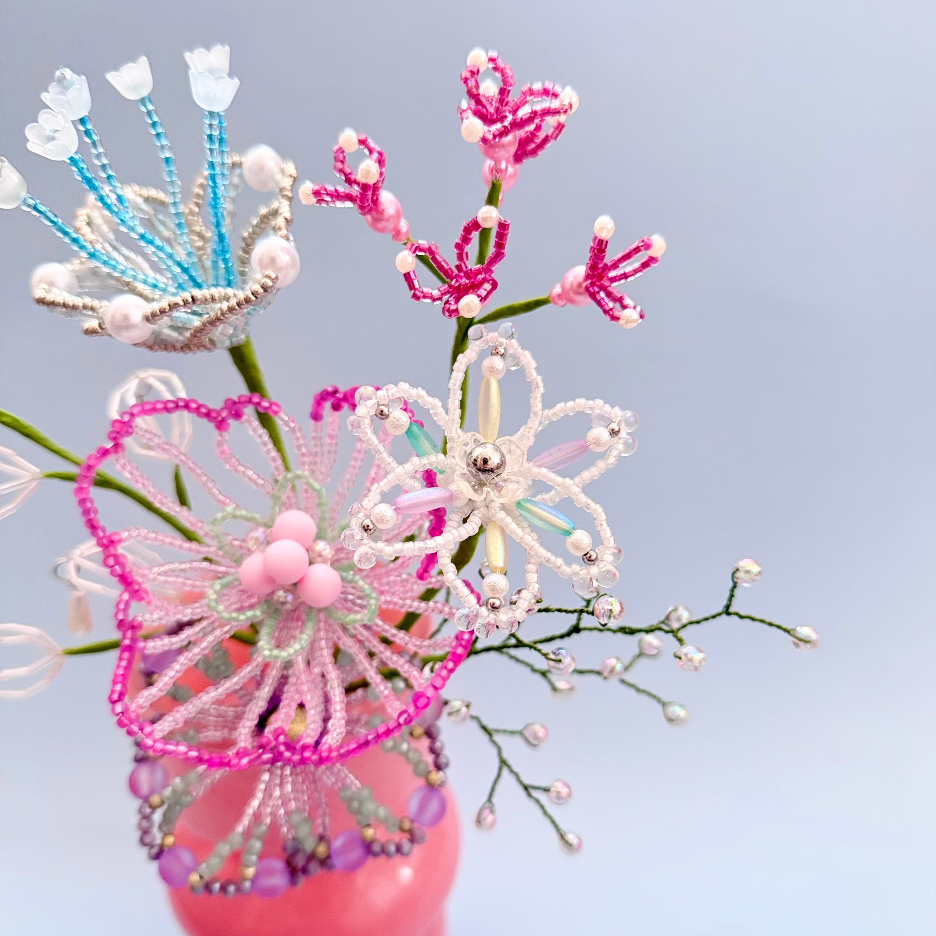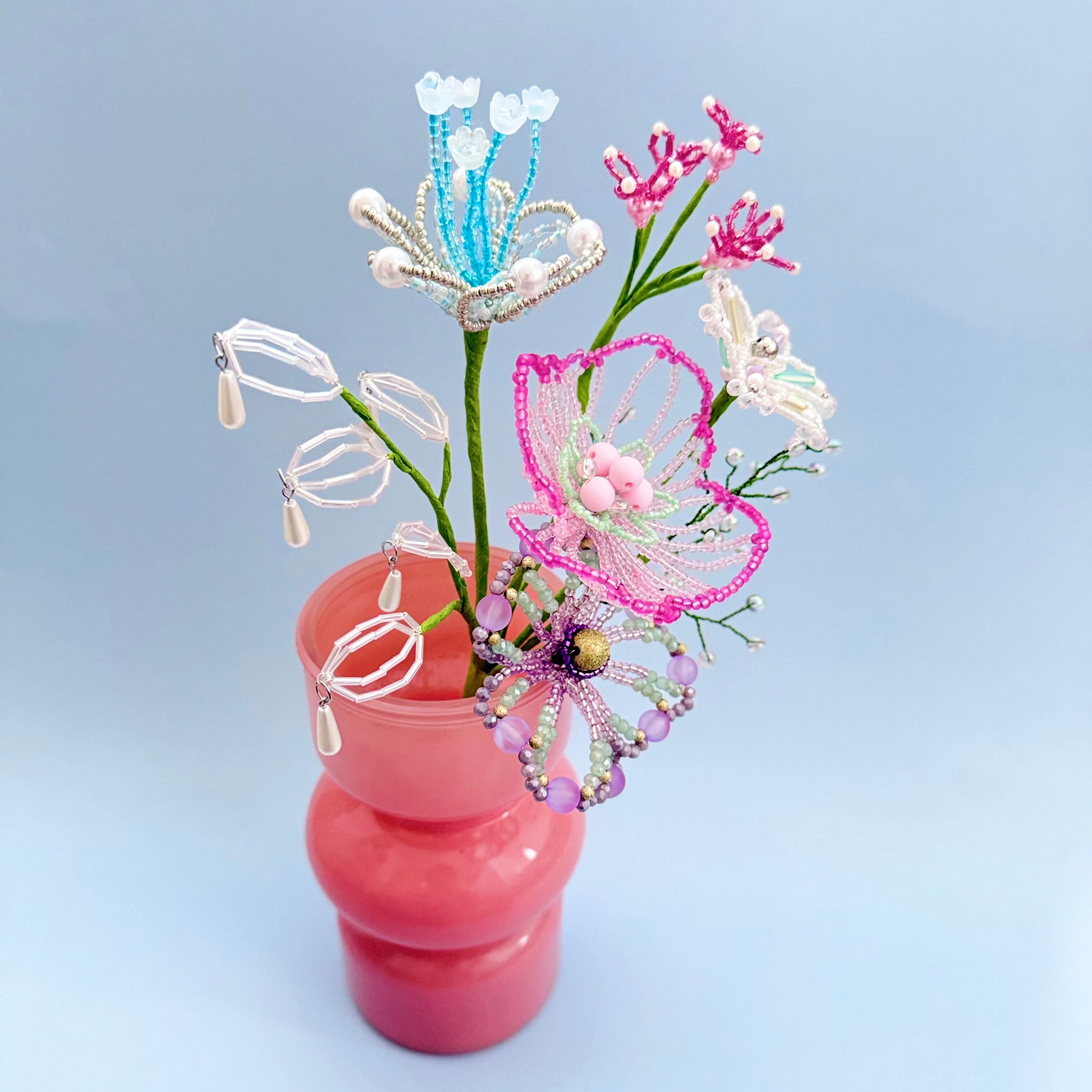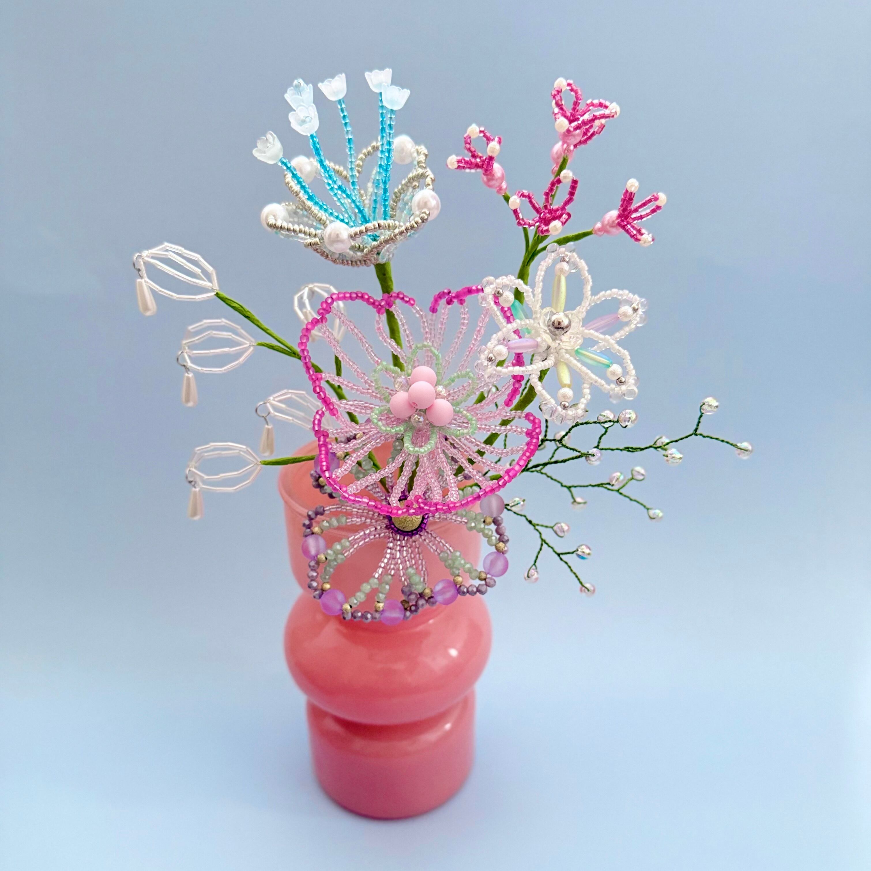 ご自身でご用意される場合、サイズが小さすぎたり軽量のものだと、ビーズフラワーの重さに耐えれず倒れる可能性があるため、陶器やガラス等の重量があるものや、ブーケと同じくらいのサイズ感のものをご用意いただくことをお勧めいたします。