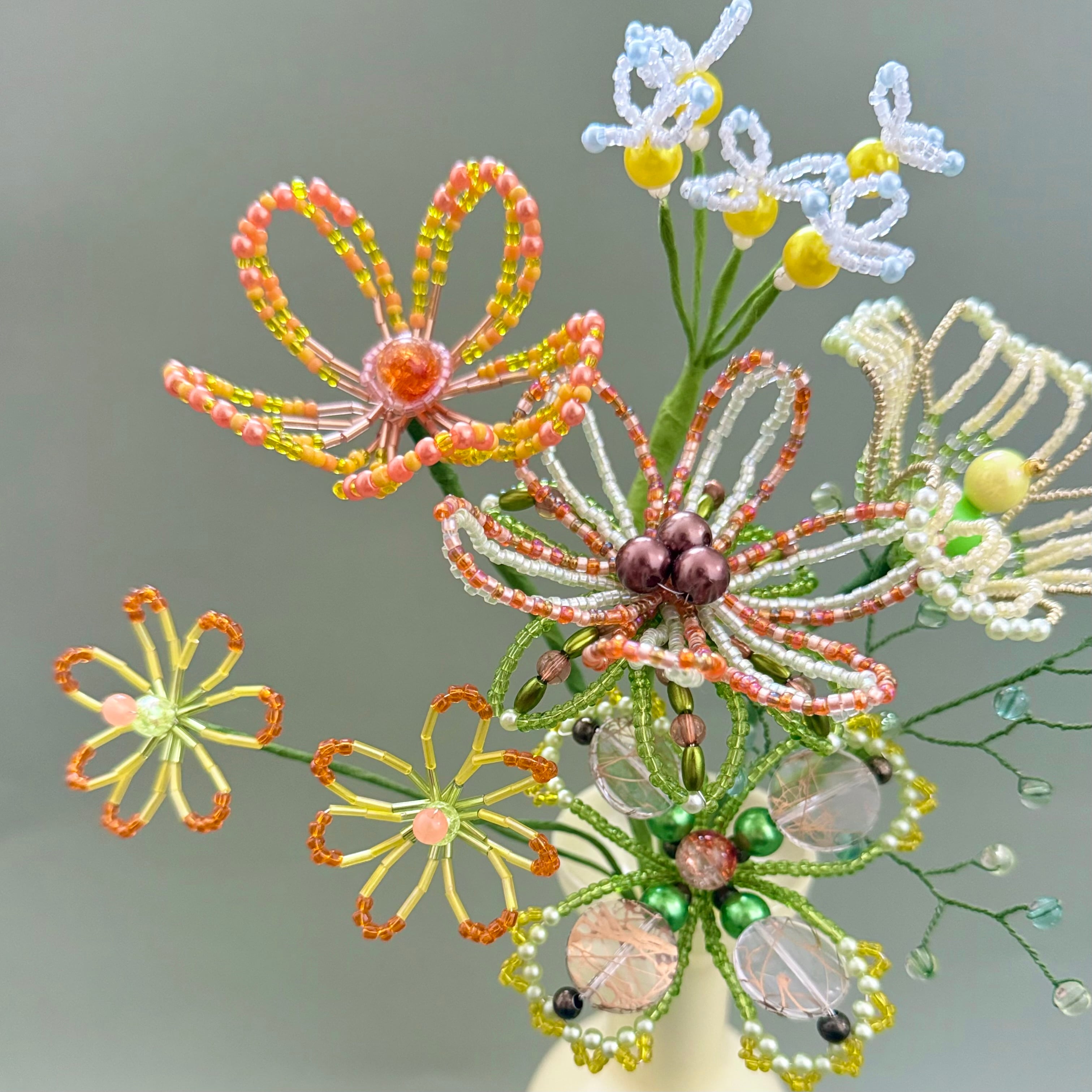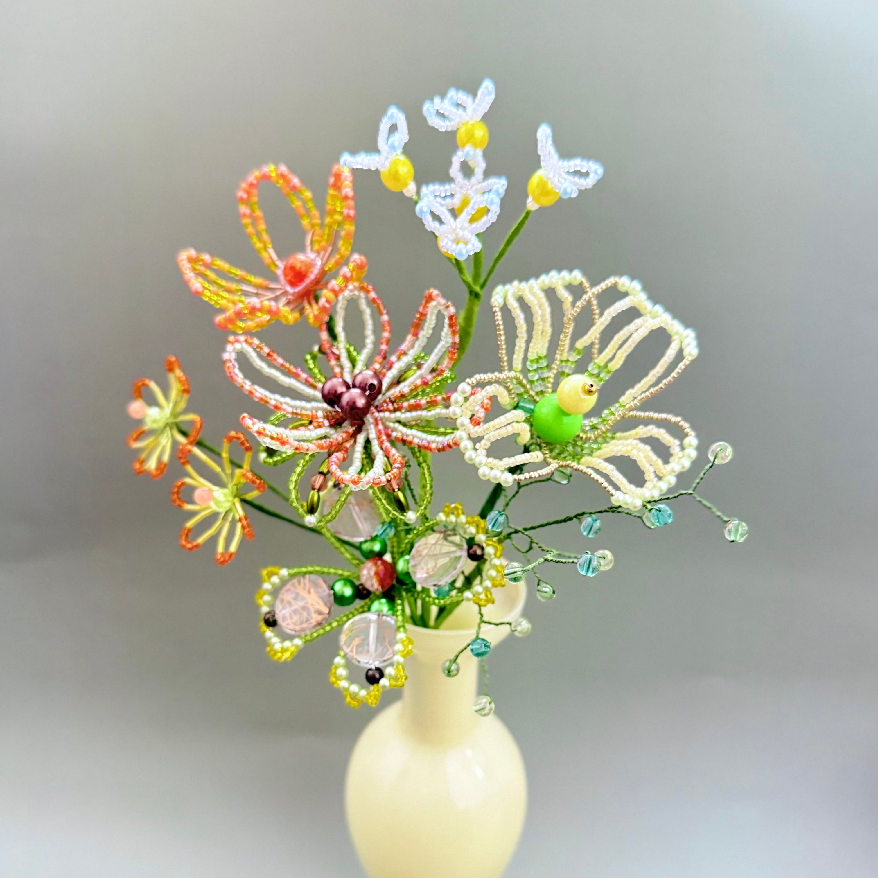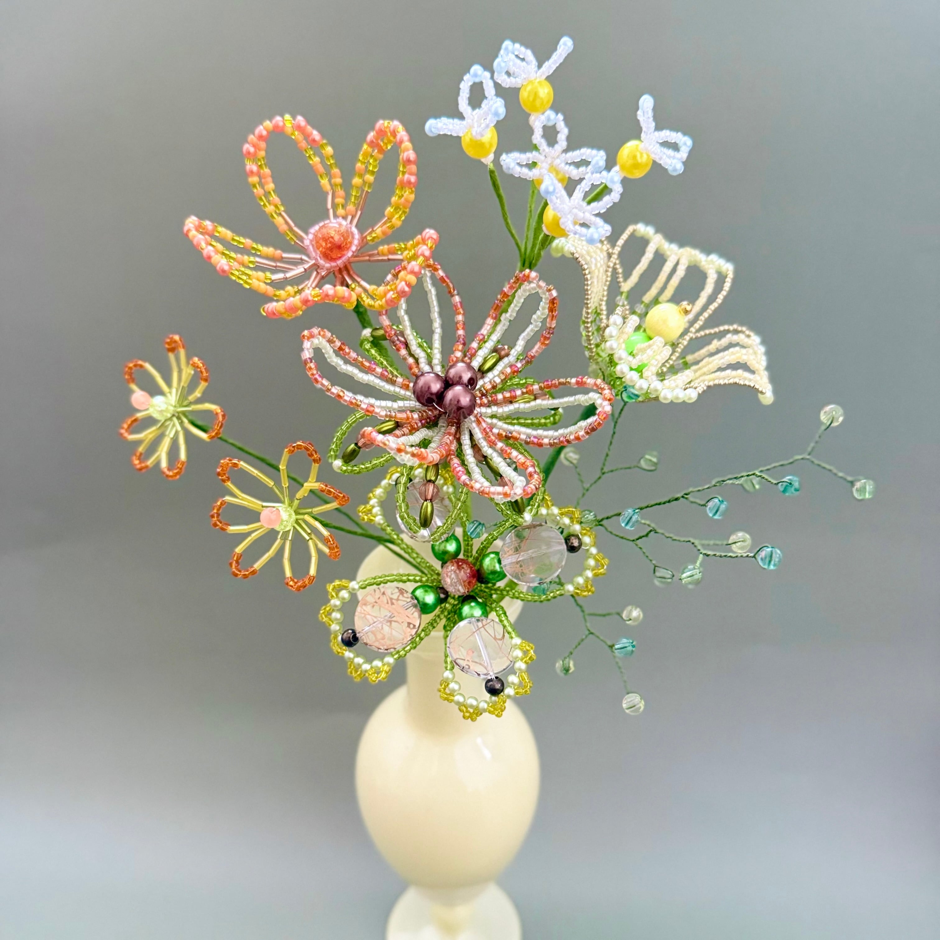 ご自身でご用意される場合、サイズが小さすぎたり軽量のものだと、ビーズフラワーの重さに耐えれず倒れる可能性があるため、陶器やガラス等の重量があるものや、ブーケと同じくらいのサイズ感のものをご用意いただくことをお勧めいたします。